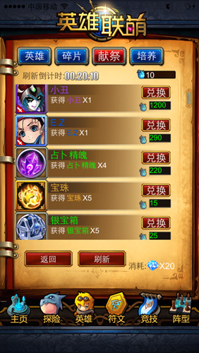 要说《英雄联萌》新版就是屌,装备系统、精英副本系统整得嗷嗷的,老拉风了,如今连英魂兑换都是花样百出,跟东莞的妹子似得,以后再不好好撸那都对不起自己下一代。新的英魂兑换系统将原版一周一更新内容的形式换成了如今一个小时一更新,玩家不用再为换心仪主角卡而默默攒好几个月英魂,而且还可以手动刷新,仅需20钻石就可以更新兑换内容,简直爽翻天。