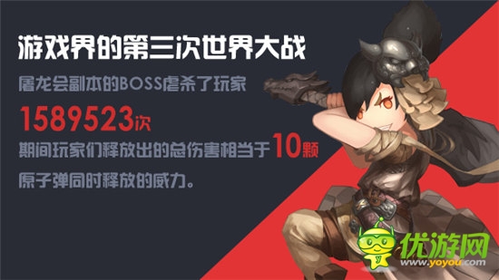 屠龙会副本的BOSS虐杀了玩家1589523次,玩家们释放出的总伤害相当于10颗原子弹同时释放的威力。