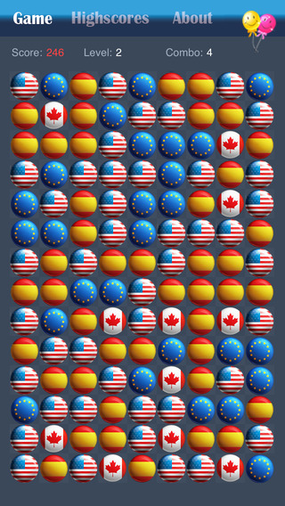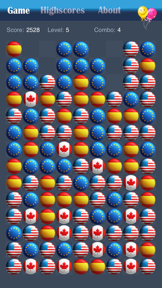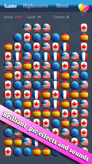 选择一组同类颜色、同类国旗的泡泡组,然后单击将其粉碎。点选相邻的相同国旗的泡泡。通过粉碎相同一排类似泡泡得分。你一次粉碎的泡泡越多,你得到的分数就会越高。