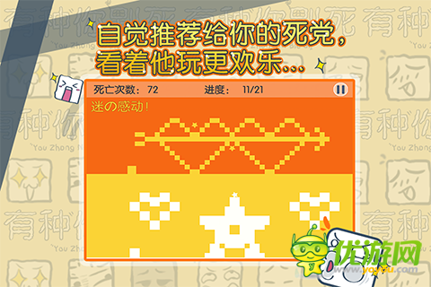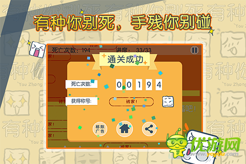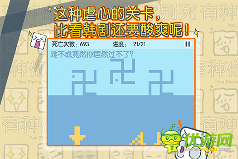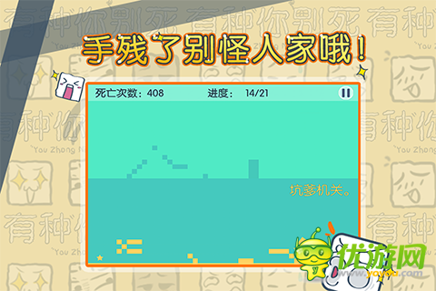 《有种你别死》是一款极具考验个人是否手残的游戏,上手超简单,只需手指轻轻地点击屏幕使方块跳起跃过障碍到达终点就可以过关,如果你以为这么简单就错了,神奇的机关,突发的事件,令你在通关的路上感受满满的惊喜。手残党慎入!不然面临砸手机的事情发生。当然也可以跟好友比比谁更加手残。
