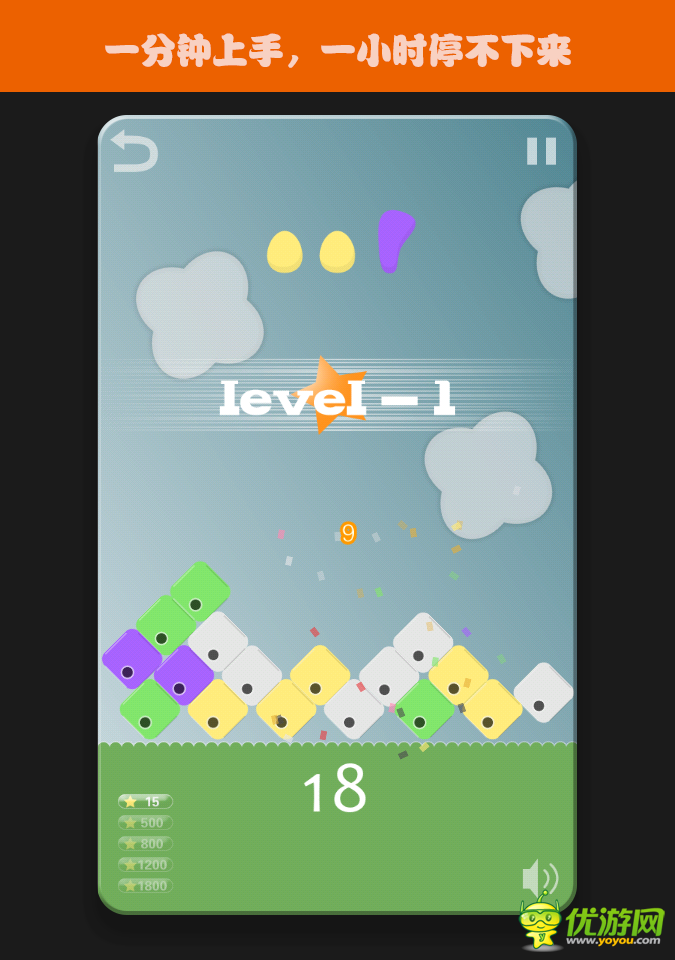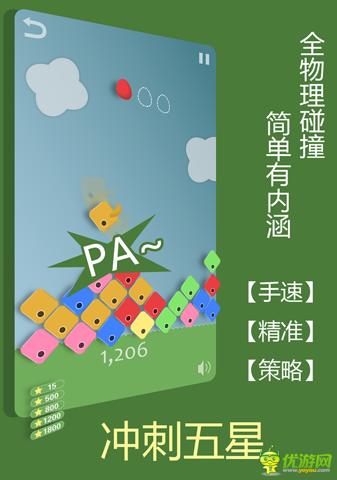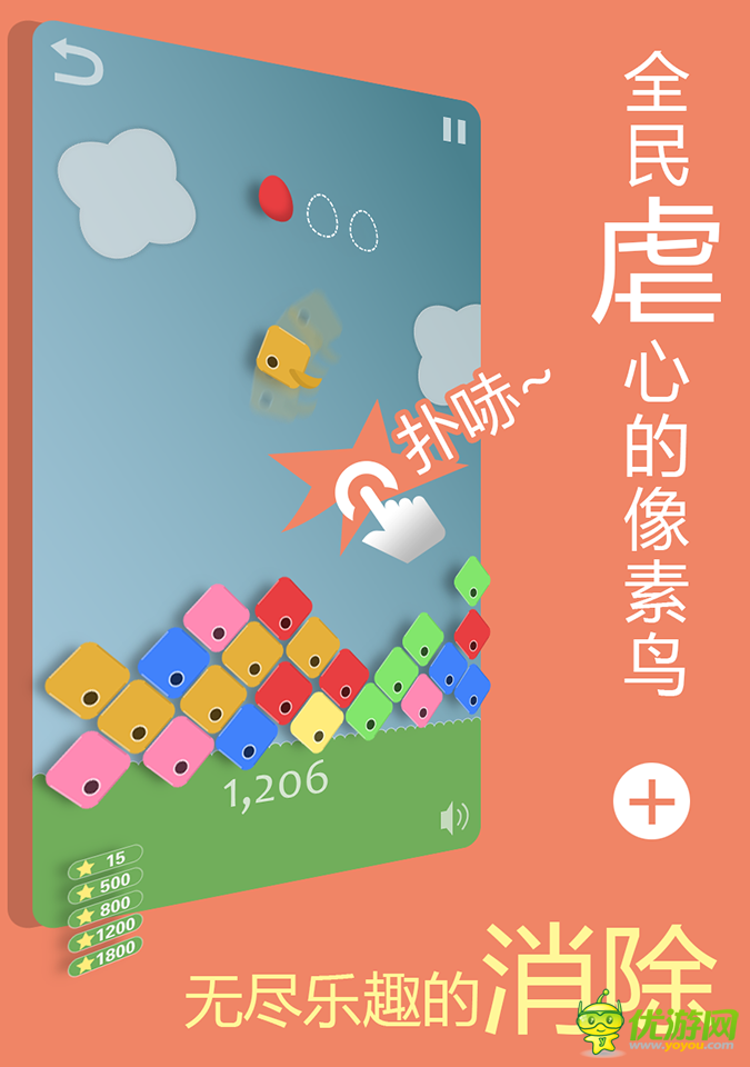 "手速"不再是决定快感的唯一,"插入"的精准,"预判"的策略,都决定着"冲刺五星"的成败。这是又一款以小鸟为主题的消除游戏,不同的却是以"物理"特性的"动作"为操作要素。画风清新可爱,配乐轻松休闲,游戏很好的融合了虐心小鸟的心跳控制体验,以物理碰撞完成的方块消除,使得更具有操作快感,“一分钟上手,一小时停不下来”欢迎给您的萌妹子推荐吧,她们喜欢朋友一起开心消除啦!