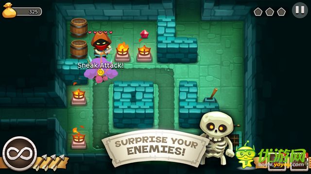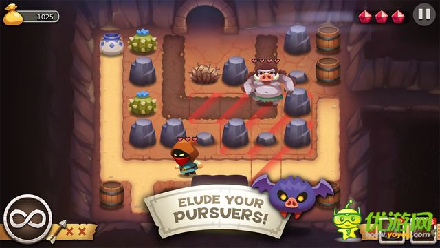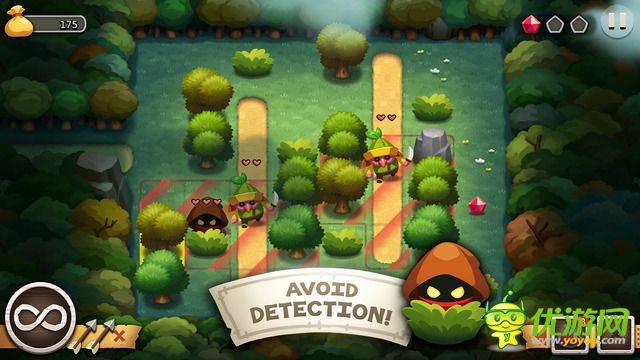 《鬼鬼祟祟-Sneaky Sneaky》是一款有着非常可爱的Q版画面的策略潜行游戏,玩家将扮演一个矮矮的小盗贼在规定的森林中的格子内移动找回宝藏。在地图中,小人通过躲在草丛里或石头旁偷袭小怪,如遇敌人,将自动展开回合制的战斗,敌我上方均以在所在的限定方格内移动。要尽量不要让敌人发现,找到的宝石可以用来购买物品道具。