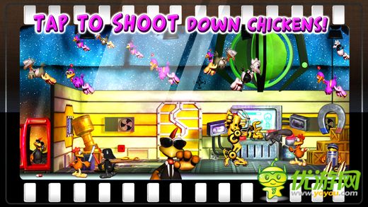 疯狂的鸡已经开始狂笑凌乱横行入侵各地电影工作室,怪鸡们将掌握拍摄主权,自导自演一部怪异大片,但总是有很多不速之客闯入,暴怒的怪鸡要根据每一关给出的任务提示,点击屏幕上的物品或鸡角色将其击毙来获取分数,所用时间越短精准度越高,分数就会越高哦。