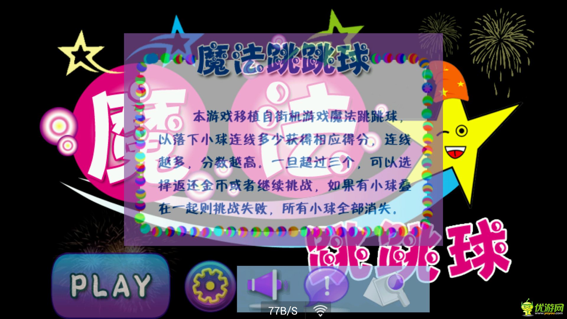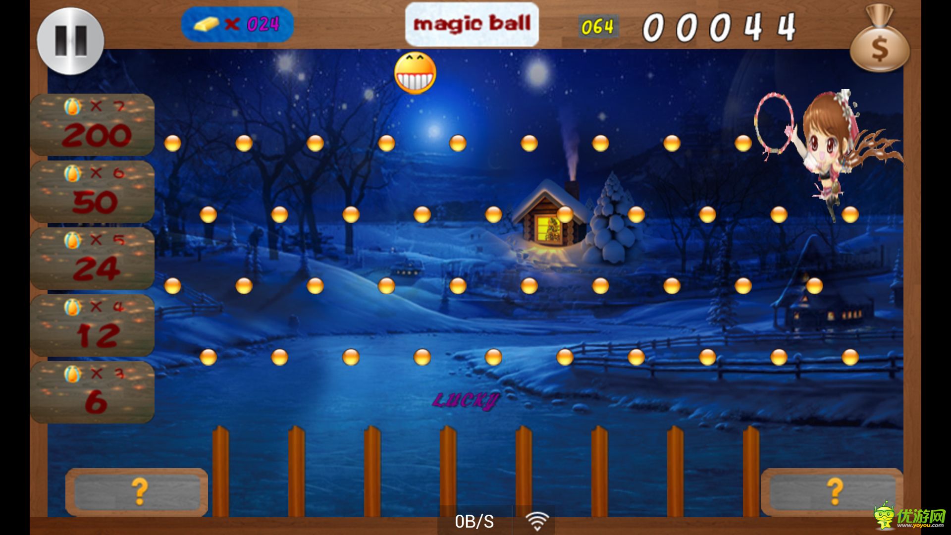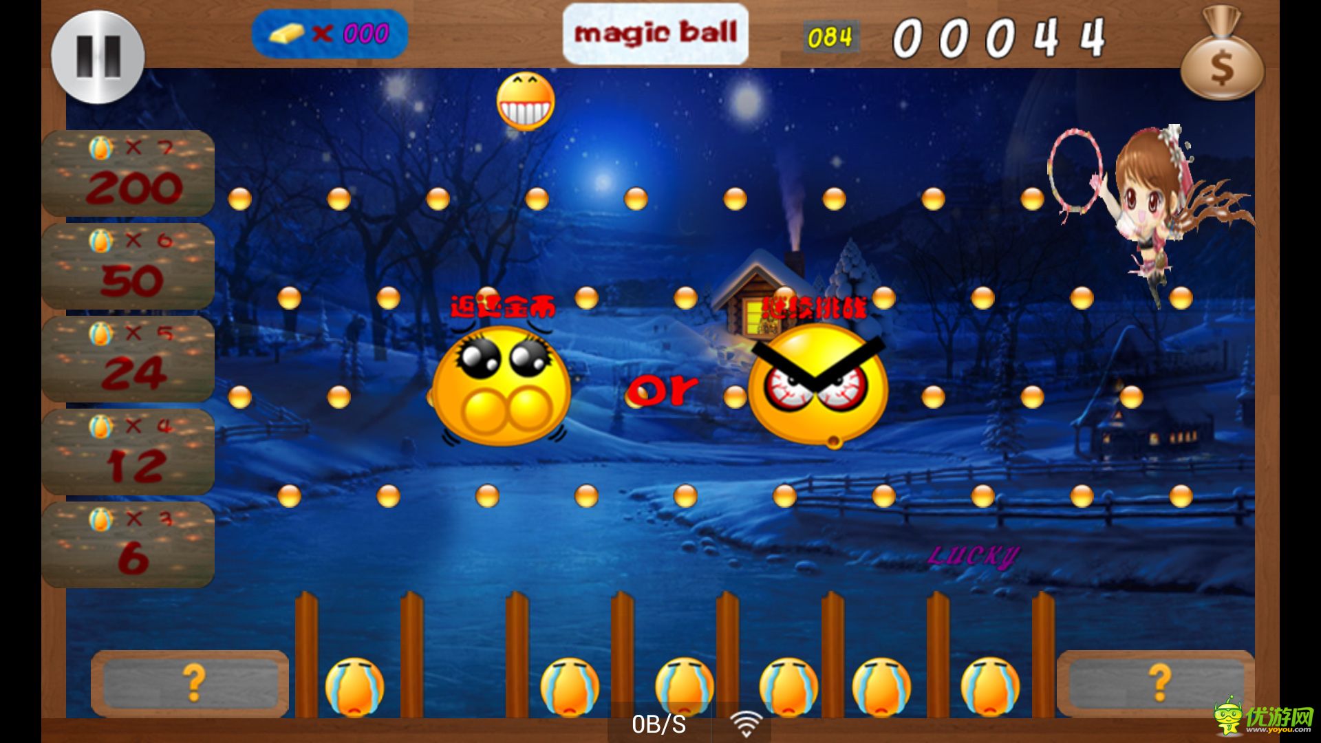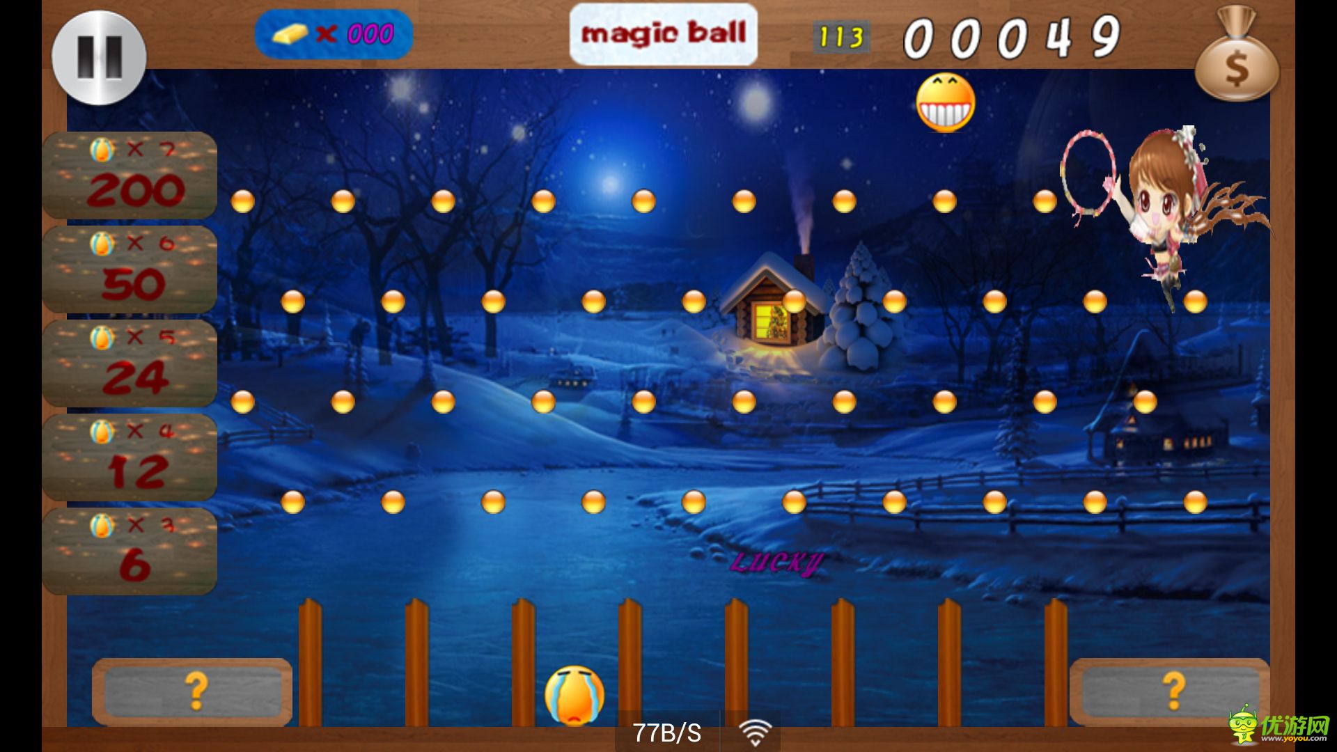 最热门的街机游戏《魔法跳跳球》Android版本出台了!玩法非常简单,但是很有趣.点击球,使其落入下方的槽中,如果形成5个球落入球槽,即可选择兑换游戏币或者是继续挑战.连得越多, 奖励越多.不过如果两个球调入同一槽中, 将消除球槽中所有的球. 球穿过lucky车, 并且出现3个相同的数字和图案的话, 将有机会玩精彩摩天轮,获得额外奖励. 更多说明可参考游戏中的帮助.除了考验人品, 更重要的是技术哦,赶紧来试试吧!