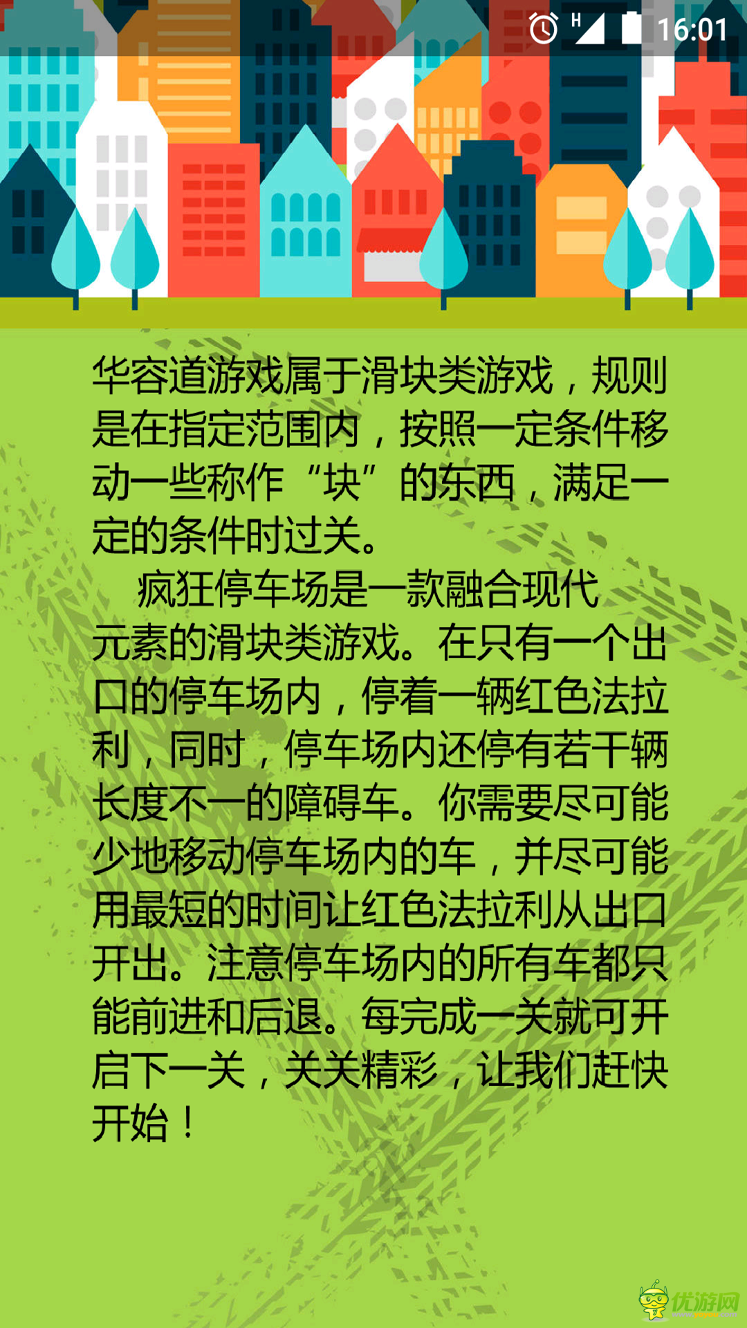 《疯狂停车场》是一款融合现代元素的滑块类游戏.在只有一个出口的停车场内,停着一辆红色法拉利,同时,停车场内还停有若干辆长度不一的障碍车.你需要尽可能少的移动停车场内的车,并尽可能用最短的时间让红色法拉利从出口开出.注意停车场内的所有车都只能前进和后退.每完成一关就可开启下一关,关关精彩。