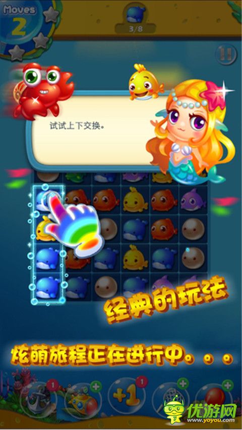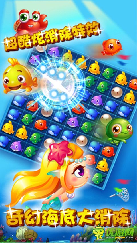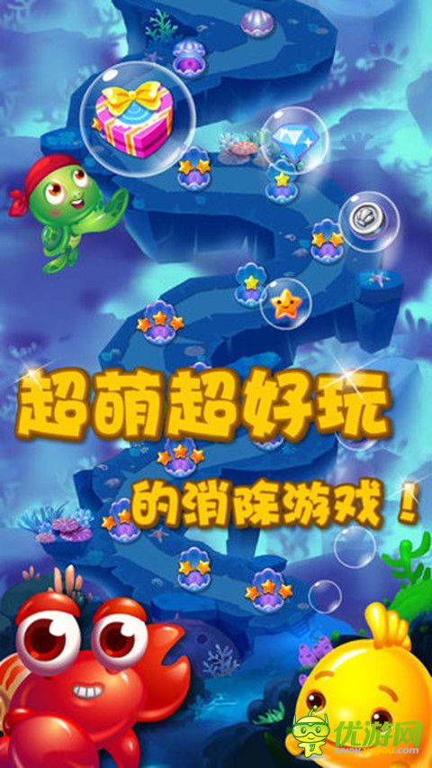 随着关卡的深入,玩家还能遇到更Q更萌的海底精灵,例如寄居蟹,带刺的泡泡鱼等等;而更多的新鲜玩法也随之而来,例如在寄居蟹周围进行三次消除才能成功收集寄居蟹噢!想收集泡泡鱼?利用消除让它进化成最终的形态吧!被冰冻困住的精灵们需要玩家的巧妙消除才能重获自由!除此之外还有珊瑚上的精灵收集数+2、精灵生病消除传染效果等等等等。更Q更萌的精灵、更多独特新颖的玩法,尽在《海底消消》!