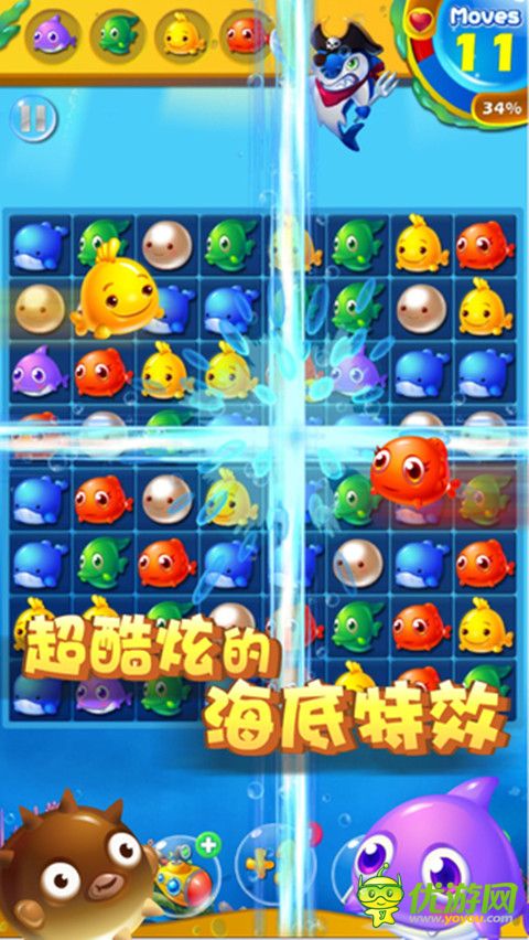 与其他传统消除游戏不同,《海底消消》还加入了一些独特的玩法例如额外加分、十字消除、同类消除等等,让消除不仅仅是为了消除;在通关的过程中玩家还可以挑战邪恶的Boss邪恶鲨,捍卫海底和平,使用道具将会使你的通关更加轻松!