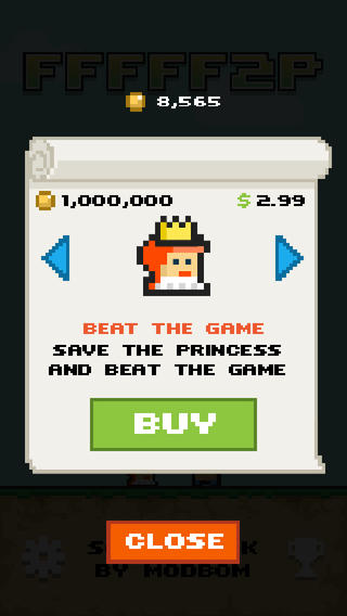 而且游戏的名字与游戏内容也有点小讽刺,首先是名字,连续使用了五个“F”来强调游戏是免费下载的。如果你细心观察,就会发现恶魔释放的方块上都写着一些:“Free-to-play”、“Cash-$$$” 等字眼,这就其实是在讽刺一些游戏,已收费为由将游戏的难度设置得很高,促使玩家消费来购买道具。