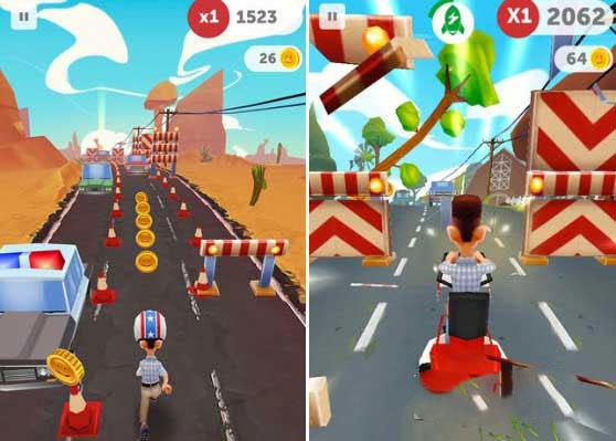 由派拉蒙影业、Genera Mobile 合作的无尽跑酷手游Run Forrest Run《奔跑吧!阿甘》游戏人物以Q版动画风为主,开头便是大家非常熟悉的阿甘和珍妮的互动,完全就是电影的动画版。然后进入游戏,玩法和其他跑酷游戏没什么太大的区别,但能看得出阿甘奔跑的速度会越来越快,公路上的车和障碍也越来越多,树木还会突然倒下,而且这里的“冲刺模式”有两种方法,一是开车,而是开滑翔机,飞天遁地,一路搜集金币。