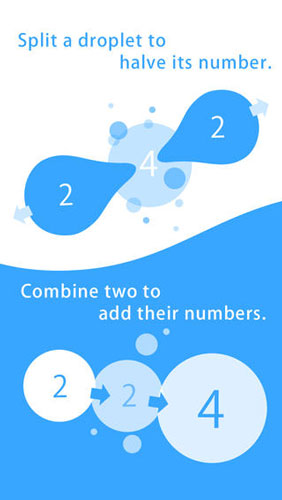 游戏界面非常简单,只有蓝与白,背景音乐舒适治愈。游戏内容非常简单,白色的圈中有一个目标数字,蓝色水滴中有一个数字,你可以把它撕开变成对等的两个数字或者把两个相同数字合在一起,拼凑成白色圈中的数字,当拼凑出白色圈中的数字,把蓝色水滴拉到白色圈中就算完成关卡。