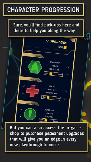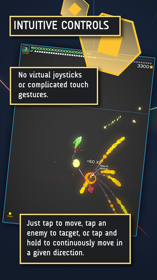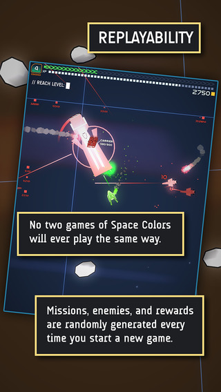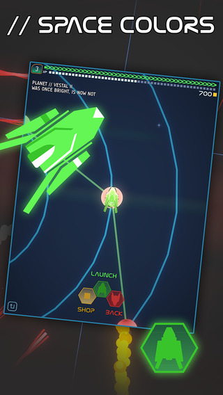 游戏中玩家需要驾驶绿色的小飞船在各种躁动的小行星之间穿梭,同时还要注意陨石和敌人的炮火,每成功射击一个敌人或者小行星都会释放一大片胜利的色彩。