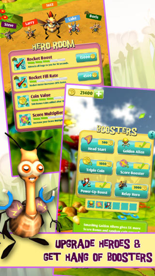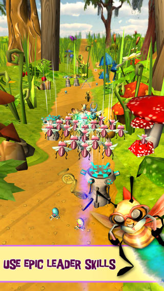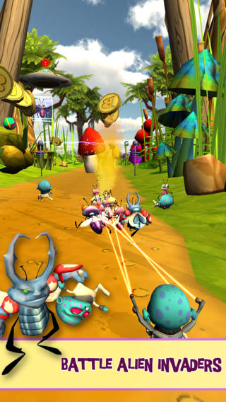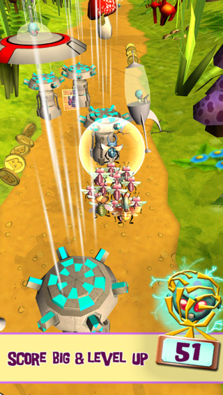 《臭虫大战外星人_Bugs vs Aliens》在昆虫的世界,遭到了外星人的侵略,几乎星球上的所有昆虫都被外星人捕获抑或杀死,整个昆虫世界岌岌可危。于是由五只各具特色的虫子英雄组成了一个队伍,向外星人的基地发起突袭,拯救其他的昆虫小伙伴,并将它们组成一支强大的军队,合力将外星人赶出地球。3D的界面让画面中的一草一木、人物都非常的真实,色彩搭配的恰到好处。游戏的玩法与任务大致有三种,首先收集一路上的金币,这是购买道具、英雄、升级的重要资源,根据玩家杀死外星人的数量与营救虫子的数量进行评分并颁发军衔升级。随着经验的增加而升级军衔,我们的虫子也逐渐的变成一名强大的空中霸主,并获得更多的战斗技巧。