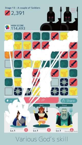 长按三个以上排列在一起的剑砖,不断收集。收集得越多攻击力就越强!排列了三个以上的剑后,请点击一下看看。能够痛击怪物进行讨伐。请讨伐不断出现的希腊神话中的怪物吧!