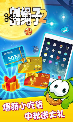 小吃货中秋送好礼,iPad mini2幸运大奖等你赢取!9月5日 ~ 9月12日更新《割绳子2》就有机会参与中秋送大礼活动。同时,最新版中还将开放全新地图“水果城堡”,城堡中等着你的除了甜蜜蜜的新场景、更加精巧耐玩的新关卡,还有第六位全新神秘小伙伴登场哦,想知道它有什么样的能力可以帮助咱们可爱的小吃货吗?这次又将有怎样的难关让你脑洞大开呢?赶快下载升级游戏,亲眼见识一下吧!