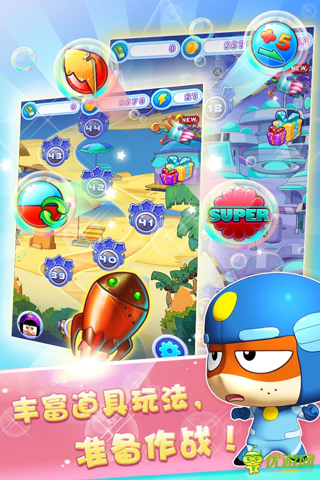 《开心爱消除》是由开心超人同名动画电影官方授权精心打造的一款益智消除类游戏。游戏的核心玩法以消除过关为主,但同时也引入了电影中的人物角色,增强了代入感。玩家将在游戏的过程中逐渐解锁电影里的角色,并且运用他们的炫酷能力来打败敌人。