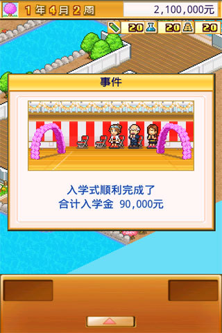 《名门口袋学院2》依然保持了Kairosoft一贯的2D画面风格,虽然整体的视觉感挺舒服的,不过老是这样风格的画面时间长了难免会有玩家觉得厌倦。所幸的是这回的《名门口袋学院2》增加了不同学院环境场景,例如普通的平原、临湖学校和山间学校等,让环境场景有所变化。游戏的音乐相当的偏向舒缓的风格,不过听起来的感觉实在有点让人昏昏欲睡,不过喜欢开罗游戏的玩家还是不要错过啦。