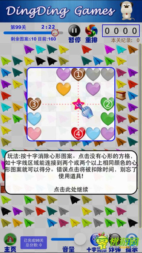 在规定时间内,点击空格,只要是十字线能连接到的相同颜色的心形图案,就能被消除并获得分数奖励。如果点击后没有能够消除的心形图案,会被扣除时间。
