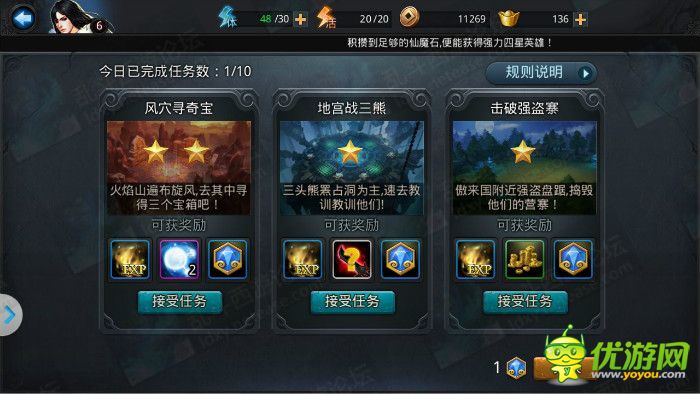 2、选择你要接受的任务。每次会刷新3个不同的任务可选,每天可进行10次,不能购买额外次数。