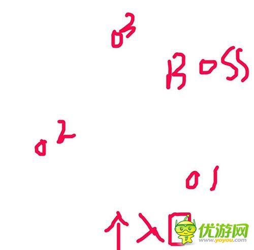 简单介绍下这关,打开三个宝箱,没有阵亡,干掉boss这样可以三星,可是这关问题在于宝箱到了时间还不去打开就会被石头封起来,,这样很多时候来不及,楼主战力1万7的时候根本拿不到三个宝箱。后来楼主发现这么个窍门,和大家说下:图三做了个简单的示意图,123分别是宝箱的位置,进来入口后直奔2号宝箱,打掉怪物打开箱子,再去3号宝箱,打开之后返回1号宝箱的位置,发现已经被石头封起来了,如图四。这个时候,让混世、猴子这样有冲击的英雄站到图四混世的位置,对着那个火把(路灯?)样子的物体使用冲击,不会直接冲进去,但是冲完之后控制英雄往进走,就会直接进去了!打掉穷奇拿到宝箱,直奔boss,中间不死人这关妥妥三星~当然楼主的办法适合像我一样的低端些的玩家,大神秒怪就没法儿说了。