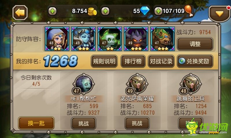 4.竞技场虽然最近几天不断失利,但是还看得过去,跟上大部队的节奏很重要,买体力如果有富裕的话,100钻的也买吧,尤其是在绿变蓝,蓝变紫的关键等级,早点变色,早点上升一个档次。不得不说,因为白虎影魔dp三剑客的风靡,我在匹配对手的时候几乎都是这三个加风行斧王电魂之类的两个一肉一核心,很多时候运气成分成为了胜负的关键。一个沉默一个眩晕,谁的影魔先放大,胜负就在一瞬间,这里我觉得还是需要修改一下平衡性,不然大家如果都是千篇一律的阵容,那么竞技场真的就只是无脑看脸的竞技场了。一般竞技场为了得到好名次,那么就在晚上八点以后开始打,尤其是在九点结算之前的十分钟,赶紧冲上一个好名次,被别人打掉了也就认了吧。白天我一般都会尝试不一样的阵容让别人打我,虽然掉名次,不过万一发现有更好的组合那岂不是赚到了。