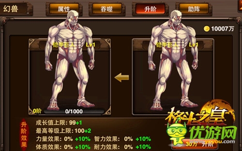 幻兽三大上限:成长值、属性值、等级,完全可以通过升阶突破,最多可以突破5次,属性加成最高为50%!升阶过程需要消耗与自身完全相同的幻兽,换言之,现在重复了的同阶同种幻兽也比过去有价值,发挥更大用途!赶快出发去收集更多幻兽吧!