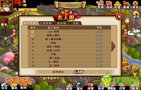 在《三国喵喵传》中,名人阁是整个喵星三国全体喵星人公认的权威英雄榜。名人阁囊括君主等级排行榜、过关斩将排行榜、竞技场排行榜、官职排行榜四个榜,其中任何一个排行榜都将显示排名前十的玩家。排行榜每24小时刷新一次,但只有前十名的玩家才能看到个人排名。此外,所有玩家都可通过竞技场查看自己的竞技场排行,竞技场的个人排名将根据PK胜败结果实时更新,邮件系统也会在第二天发放竞技场奖励时显示排名。