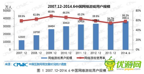 根据中国互联网络信息中心CNNIC《第34次中国互联网络发展状况统计报告》数据,截至2014年6月,中国网络游戏用户规模达到3 68亿,较去年底规