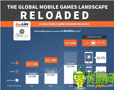 今日,移动游戏营销机构AppLift和荷兰市场研究公司Newzoo今晨联合发布了一份最新报告。报告预计,至2017年,全球移动游戏收入规模将从2013