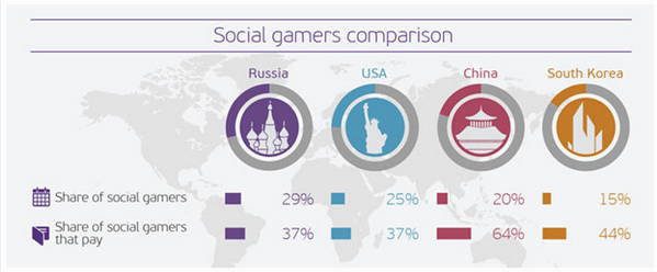 荷兰市场分析公司Newzoo近期发布了俄罗斯市场分析公司Mail Ru的分析报告,有关俄罗斯游戏市场与美国、中国、韩国游戏市场的对照图。从中我