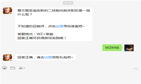蔡文姬圣诞皮肤的二技能向前发射的是一组什么呢?今天的王者荣耀考验的是玩家对蔡文姬圣诞皮肤的了解程度,相信这对喜欢玩蔡文姬的玩家并不难。下面小编就为大家带来正确的答案。