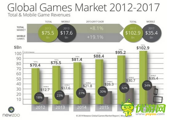 高速增长的全球移动游戏市场2014全球游戏市场规模达到814亿,智能终端占27%,218亿美元。2014年中国移动游戏市场,将占全球市场的17%, 37亿美