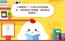 小鸡接到了一个陌生手机号码来电,自称是支付宝客服,请问是否该相信?在如今的社会,很多用户都缺乏资金安全意识,骗子的骗钱伎俩层出不断。下面小编就来给大家公布下今天的正确答案