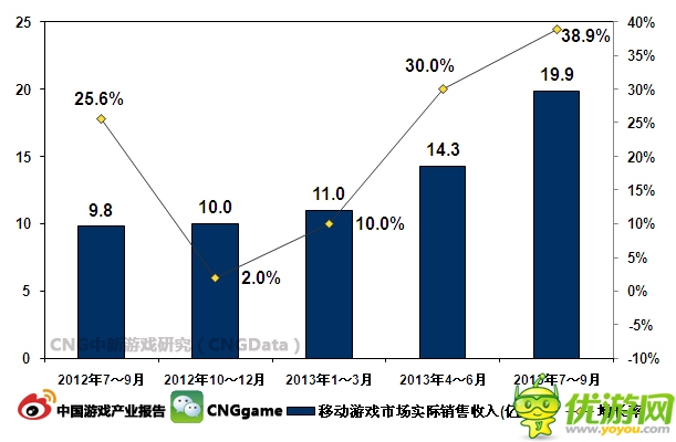 据中国版协游戏工委、CNG中新游戏研究联合发布的《2013Q3中国移动游戏产业报告》显示,2013年7~9月中国移动游戏市场实际销售收入约19.9亿...