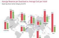据国外Chartboost发布的2013年第四季度Distimo调查报告中显示:中国大陆地区移动游戏的CPI(Cost Per Install即:每新安装应用所需成本)及平均营收值均低于全球其他地区。